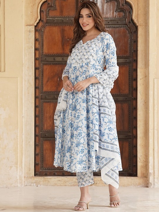 Floral Printed Gotta Patti Pure Cotton Anarkali Kurta with Trousers & Dupatta