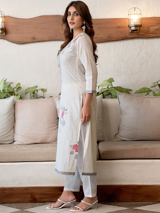 White, pink and grey printed Kurta with Trousers with dupatta