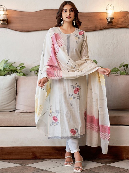 Floral Printed Jacquard Straight Kurta with Trousers & Dupatta
