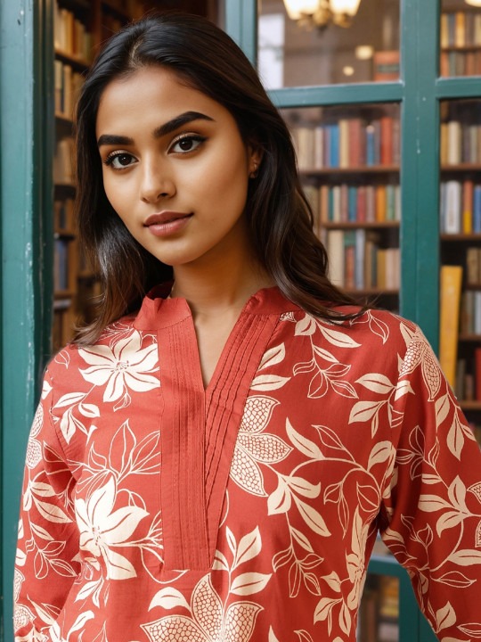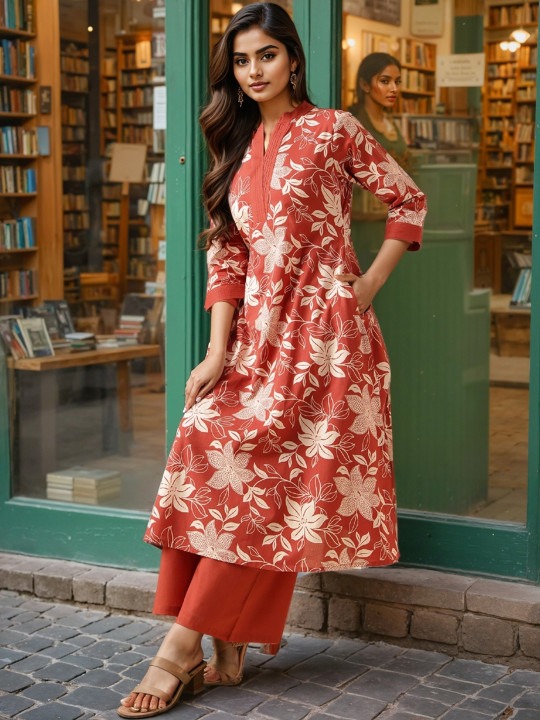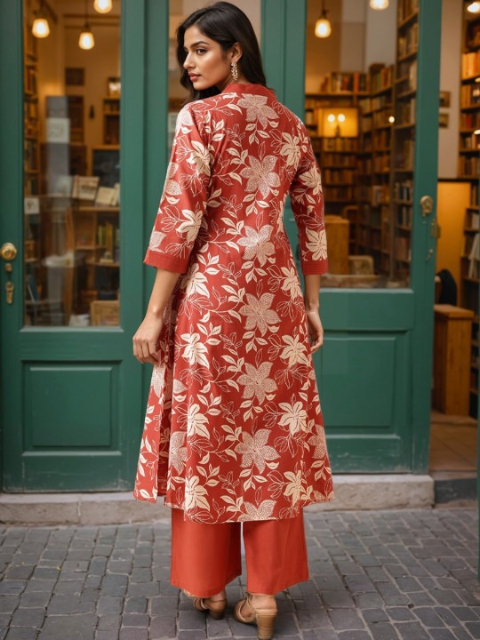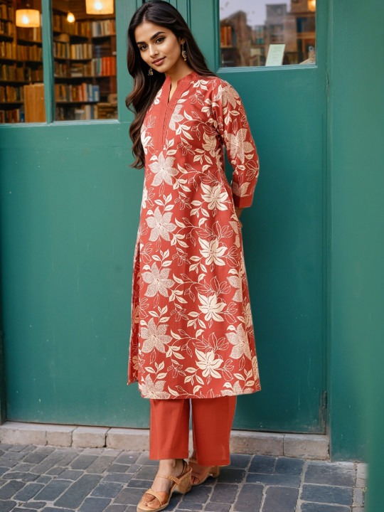 Floral Printed Mandarin Collar Pure Cotton A-Line Kurta With Palazzos
