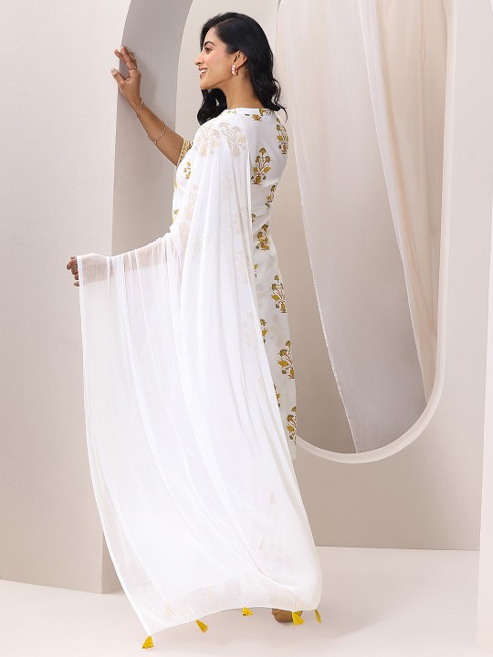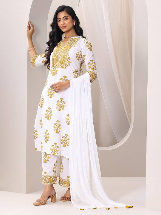 Floral Printed Mandarin Collar Straight Kurta With Trousers And Dupatta