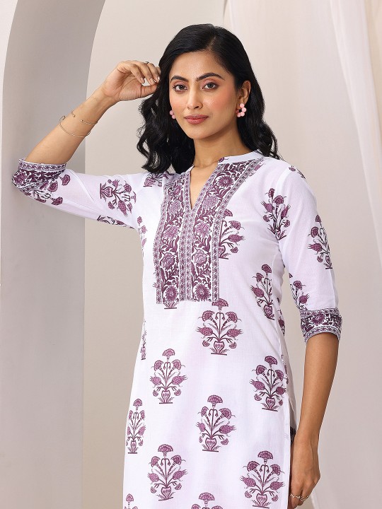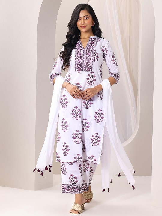 Floral Printed Mandarin Collar Straight Kurta with Trousers & Dupatta