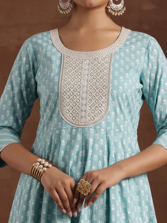 Floral Printed Panelled Thread Work Pure Cotton Kurta Set
