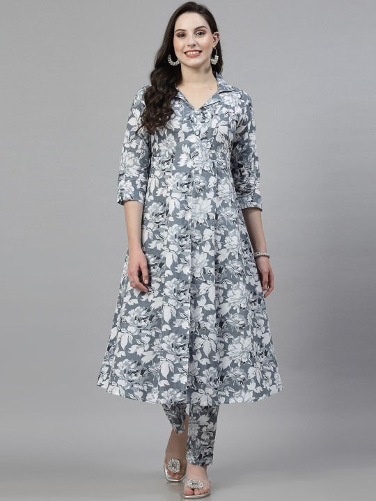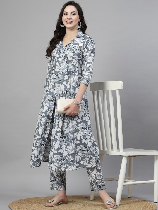 Floral Printed Shirt Collar Pure Cotton Straight Kurta with Trousers