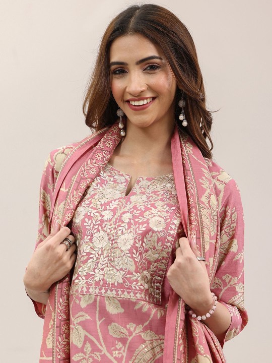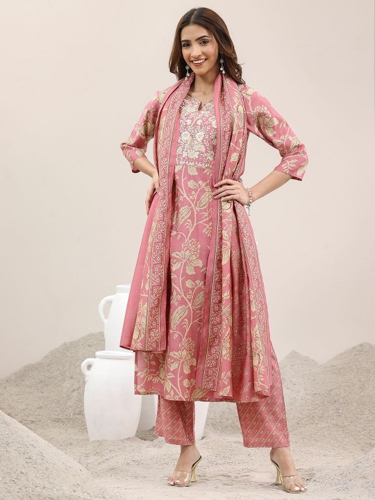 Floral Printed Thread Work Straight Kurta with Trousers & Dupatta