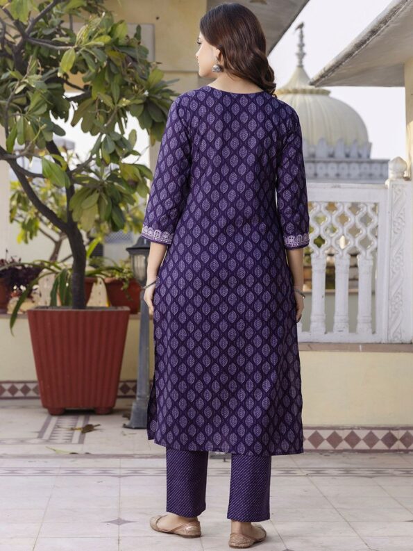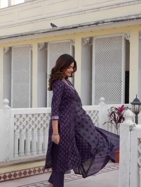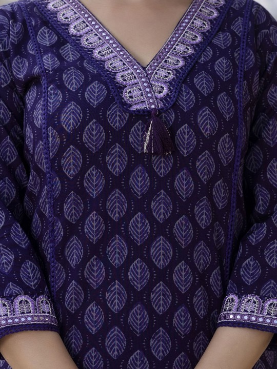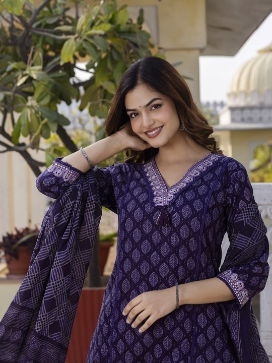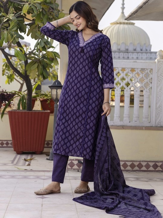 Floral Printed Thread Work V-Neck Straight Pure Cotton Kurta With Trousers & Dupatta