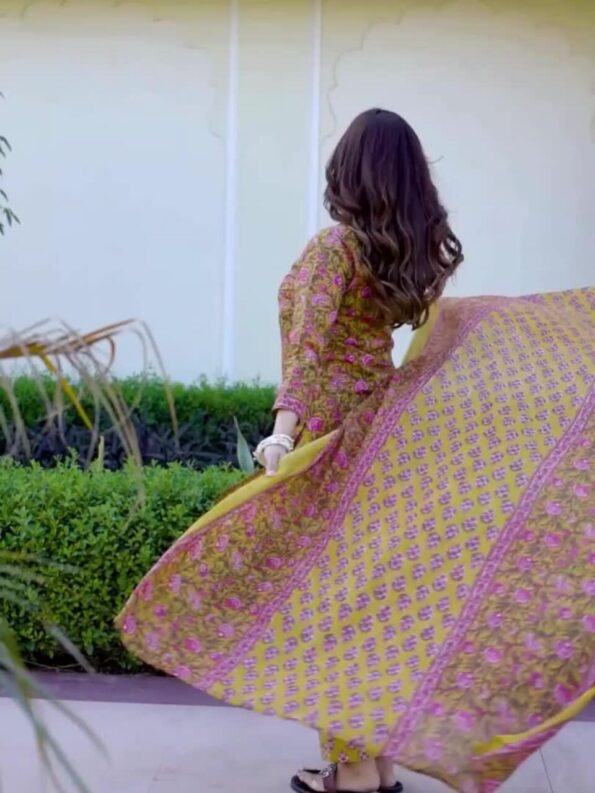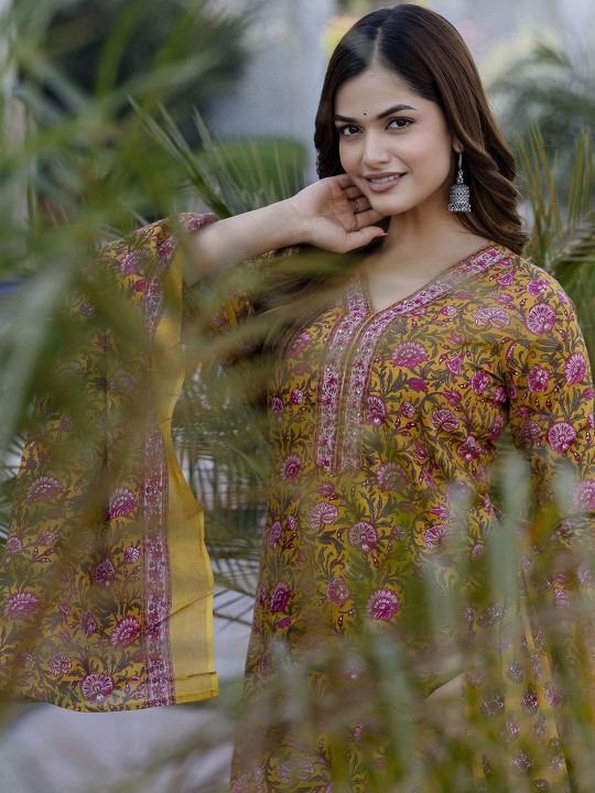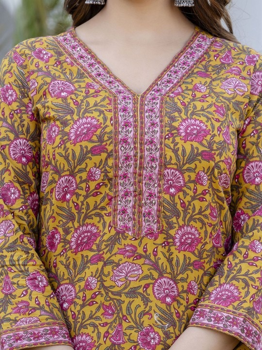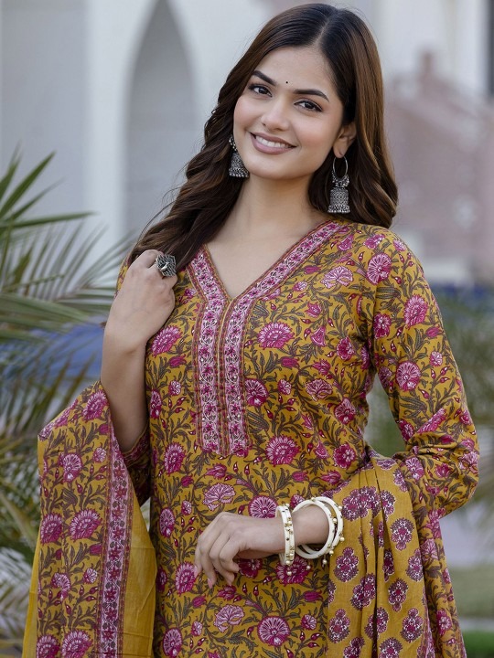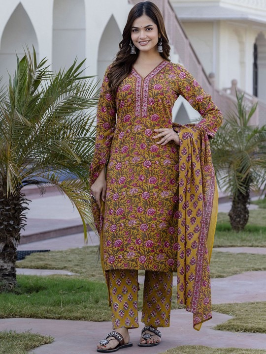 Floral Printed V-Neck Pure Cotton Straight Kurta With Trousers & Dupatta
