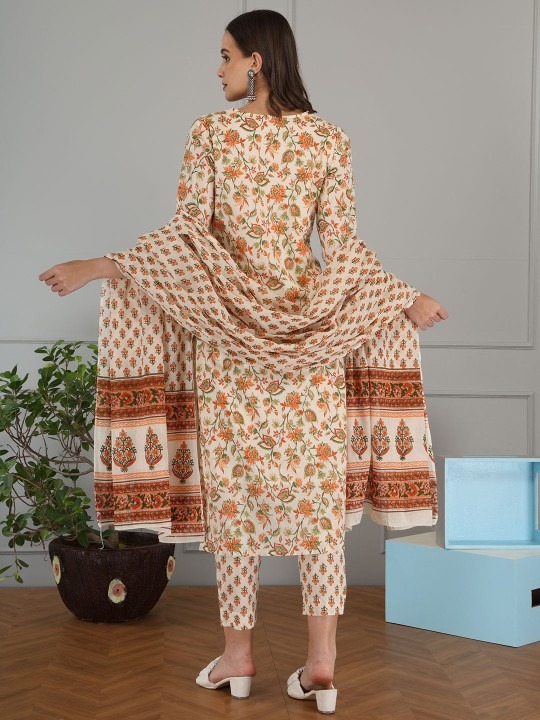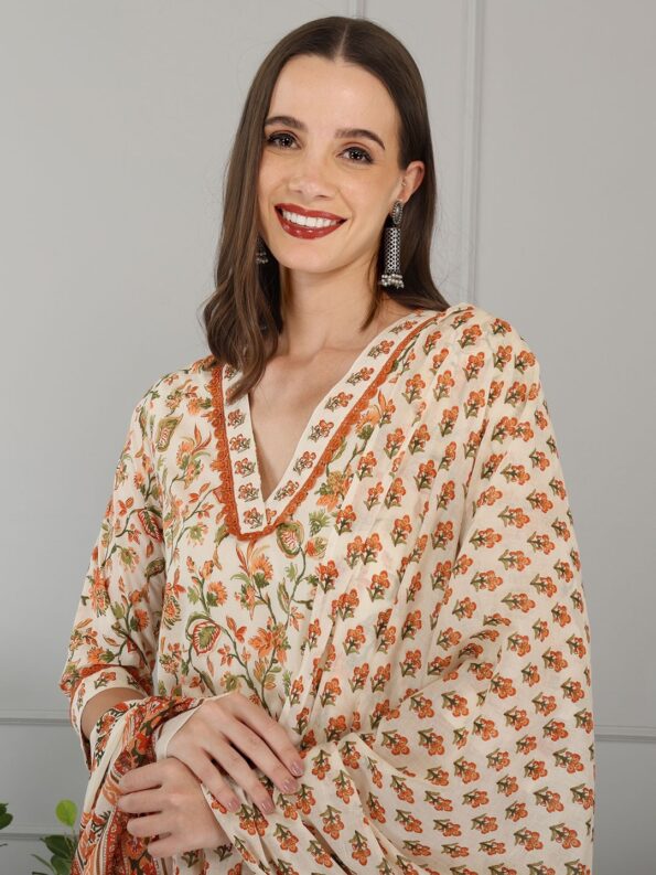 Be the first to review “Floral Printed V-Neck Pure Cotton Thread Work Straight Kurta With Trousers & Dupatta”