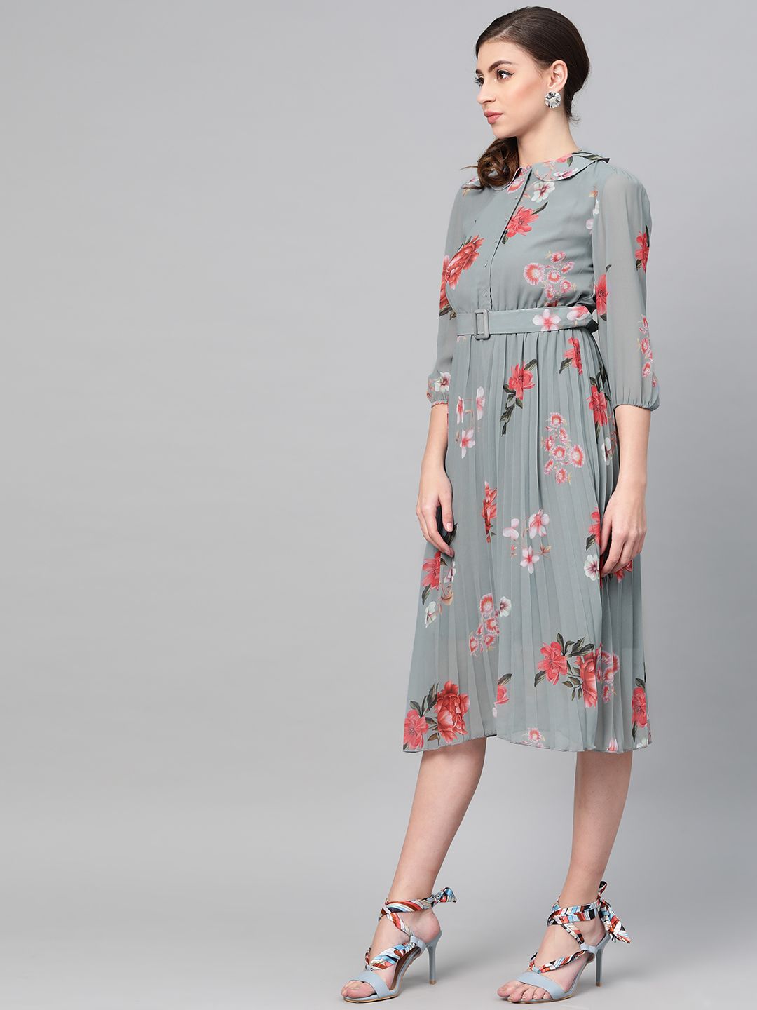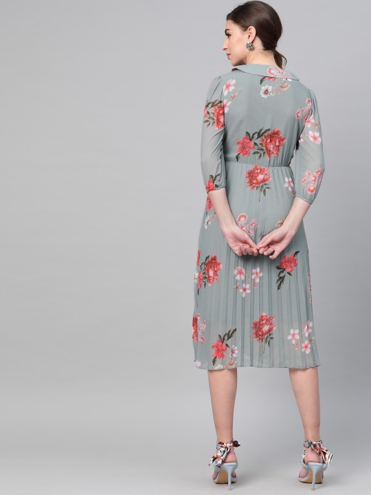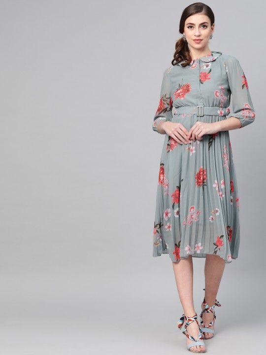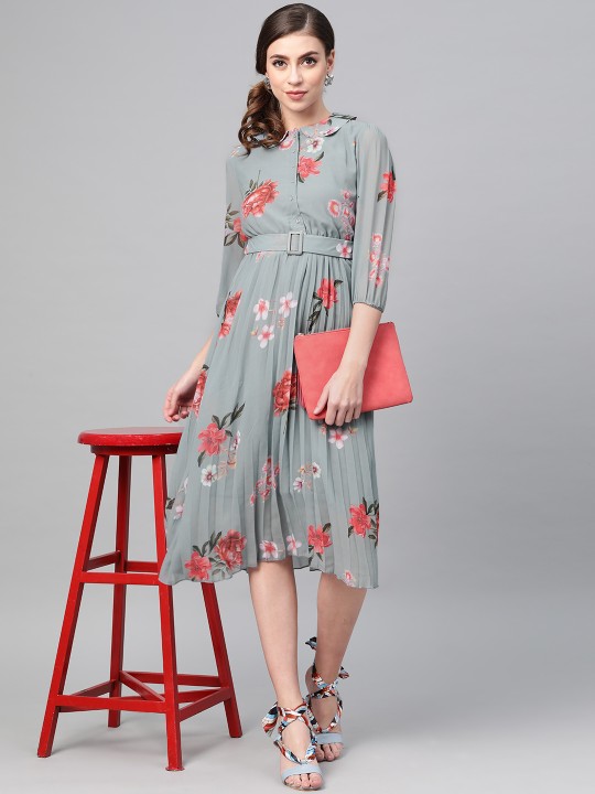 Grey & Peach-Coloured Floral Printed Accordian Pleat Fit & Flare Dress