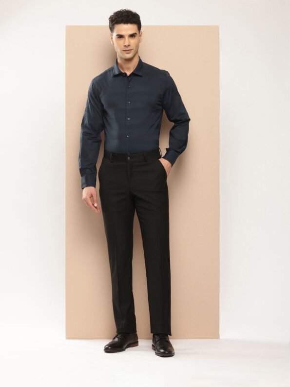 Navy blue horizontal stripes opaque formal shirt, has a spread collar, button placket, long regular sleeves, curved hem