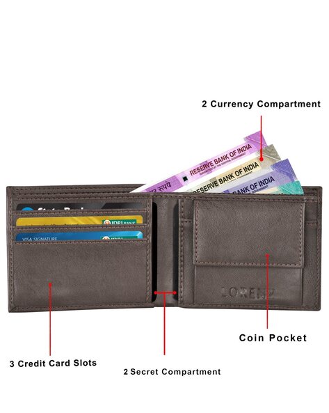 Three credit card slots, two secret compartments, two note compartments, one coin pocket