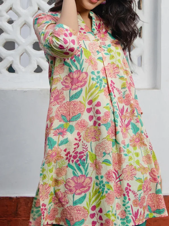 Elevate your modern wardrobe with a rich cotton floral printed Tunic. The multicolor A-Line style features a mandarin collar with a button placket and loop closure. Embraced with rich florals and pocket detail the tunic adds to the perfect comfortable summer spring vibe. Pair it with your favorite denims or pants and add accessories to accentuate the overall style for any casual occasion.