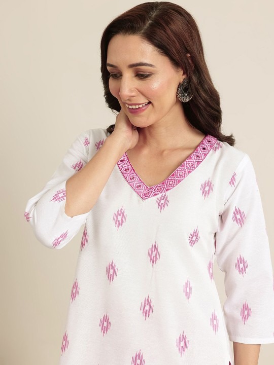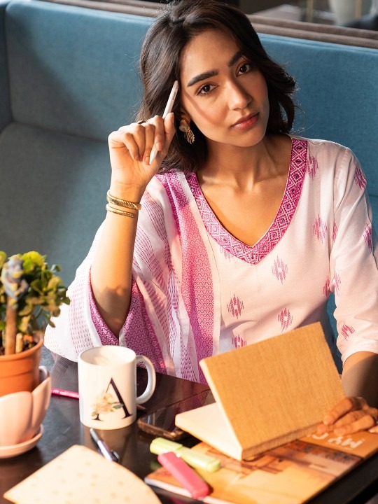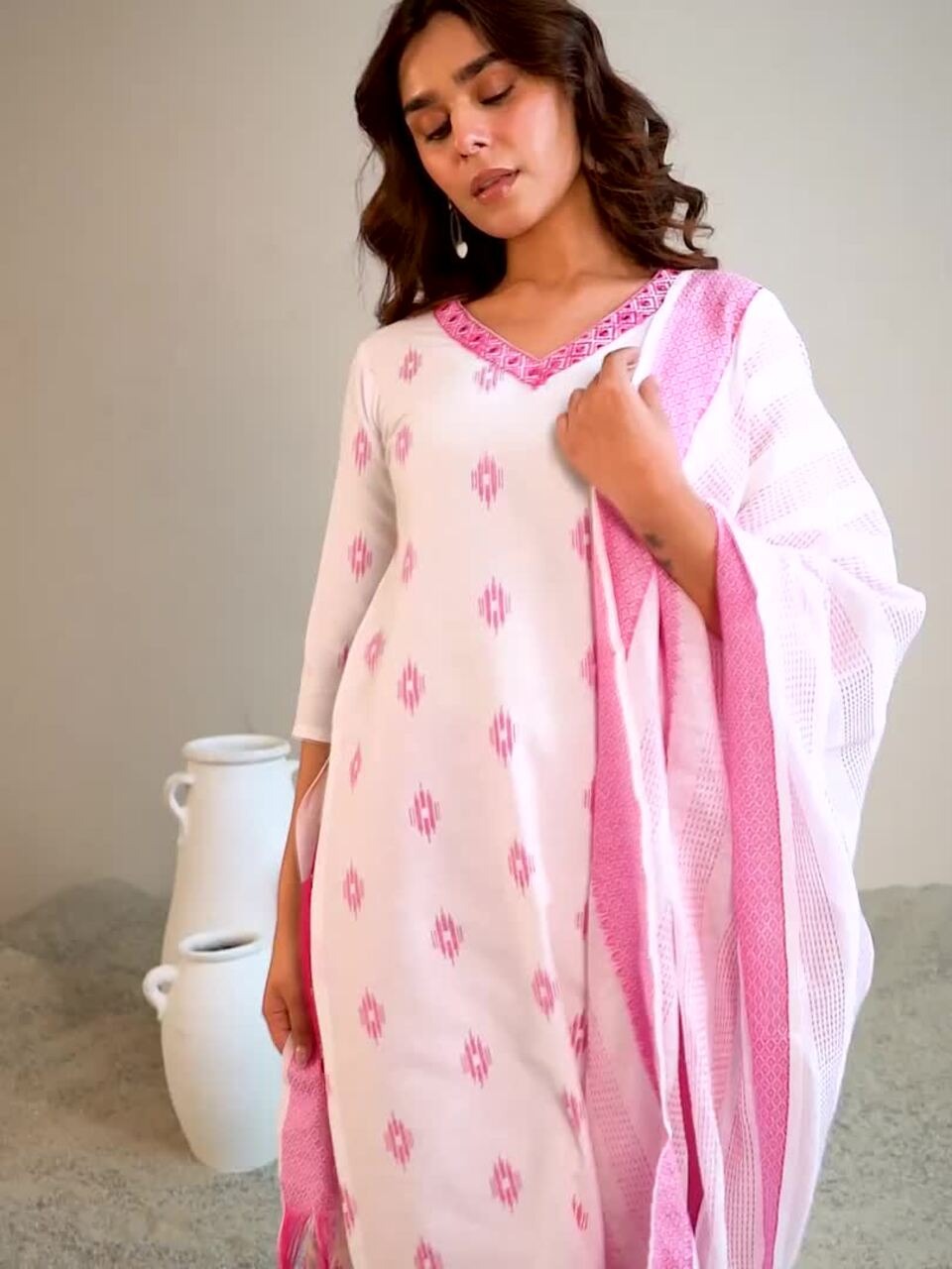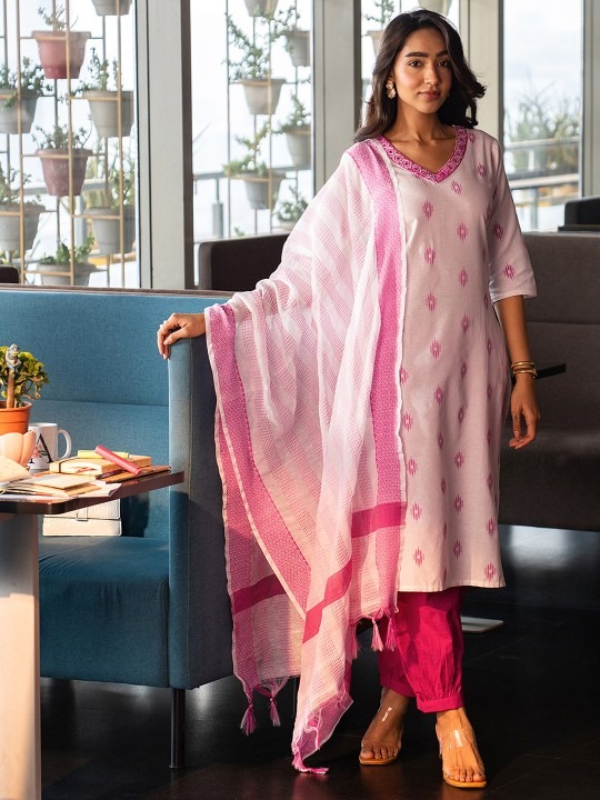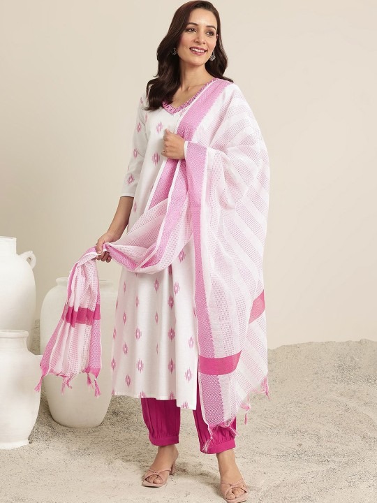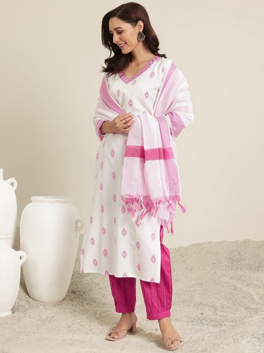 Off White Abstract Woven Design Mirror Work Straight Kurta With Salwar & Dupatta
