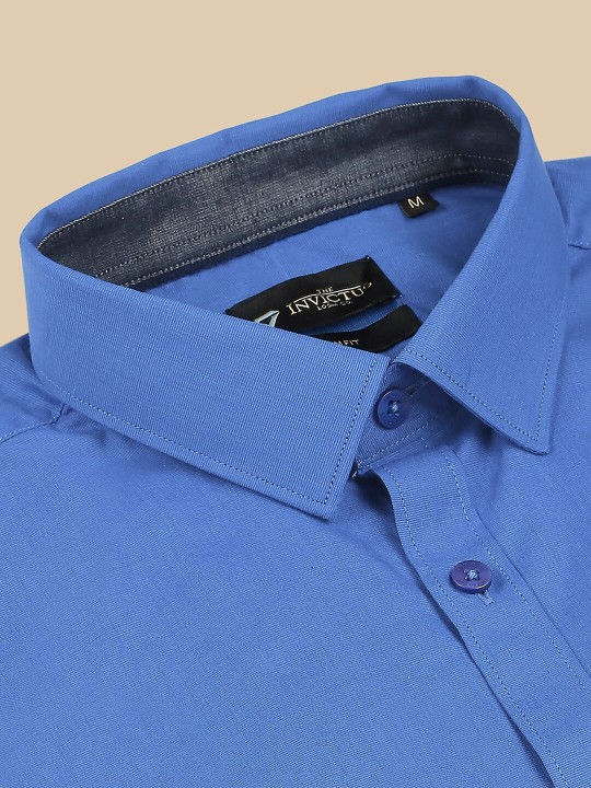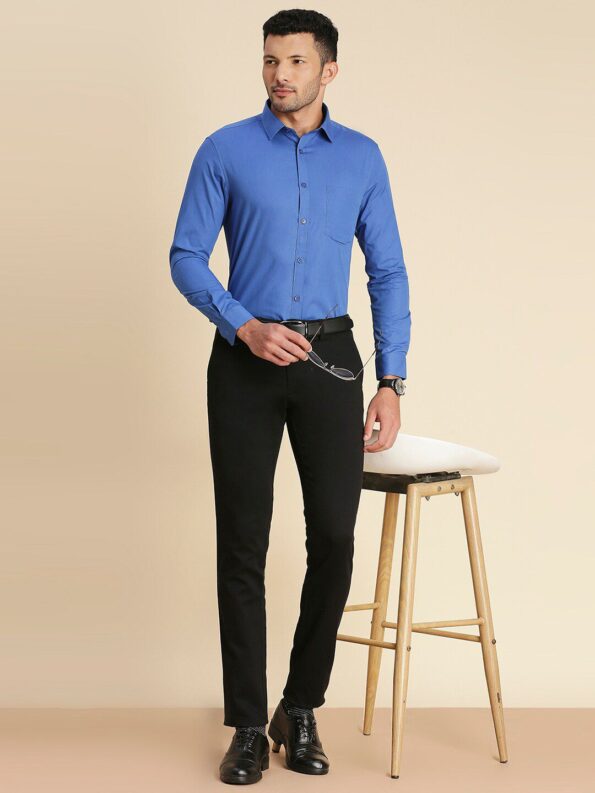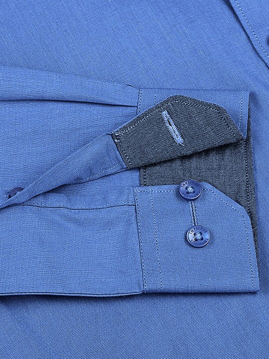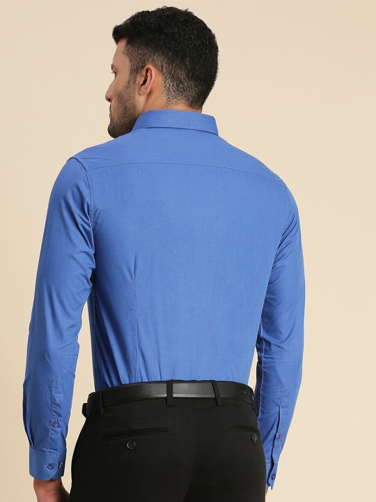 Blue solid opaque formal shirt ,has a spread collar, button placket, 1 patch pocket, long regular sleeves, straight hem