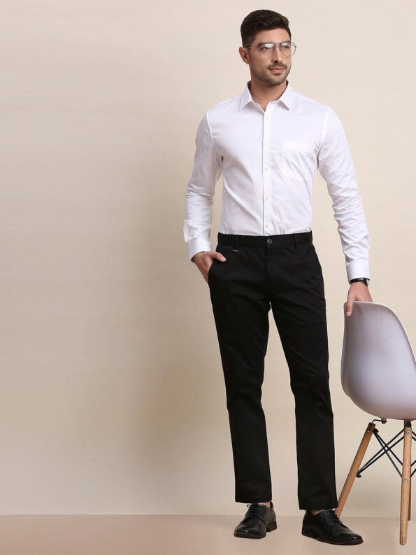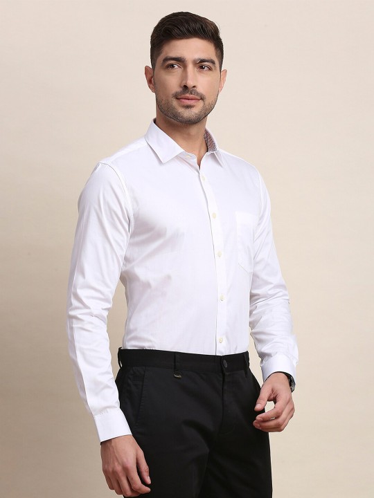 White solid opaque formal shirt, has a spread collar, button placket, 1 patch pocket, long regular sleeves, straight hem