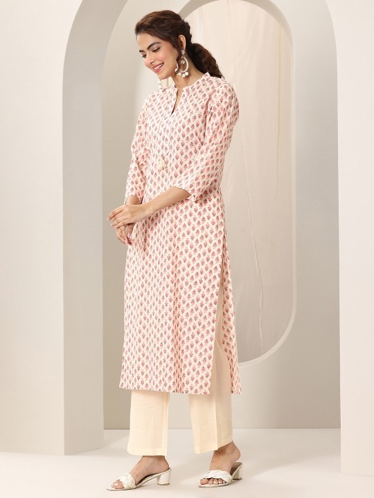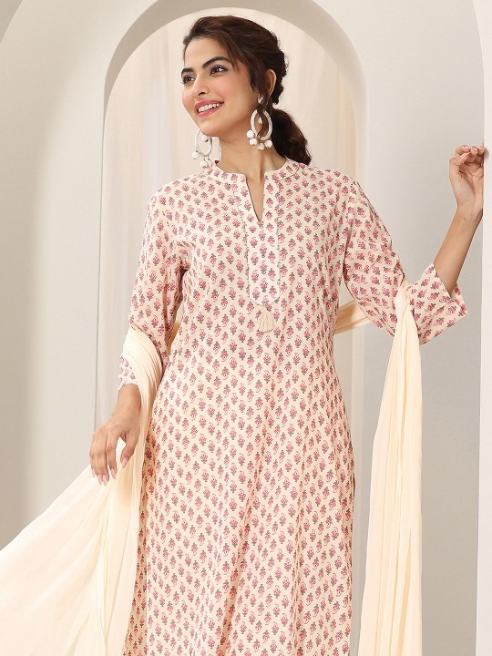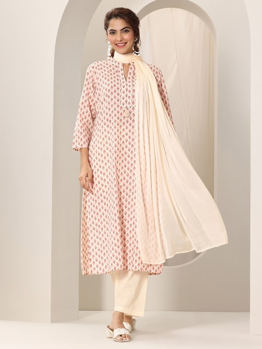 Off white & pink , green printed Kurta with Trousers with dupatta