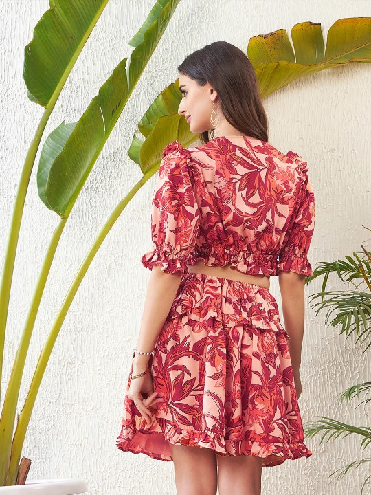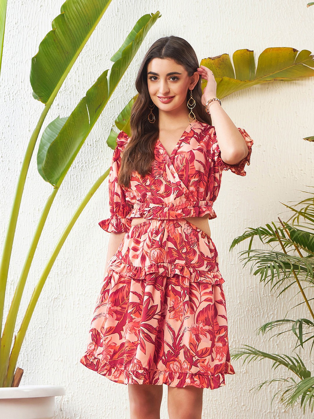 Peach-Coloured Floral Printed Cut-Out Georgette A-Line Dress