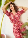 Peach-coloured & rust floral print a-line dress