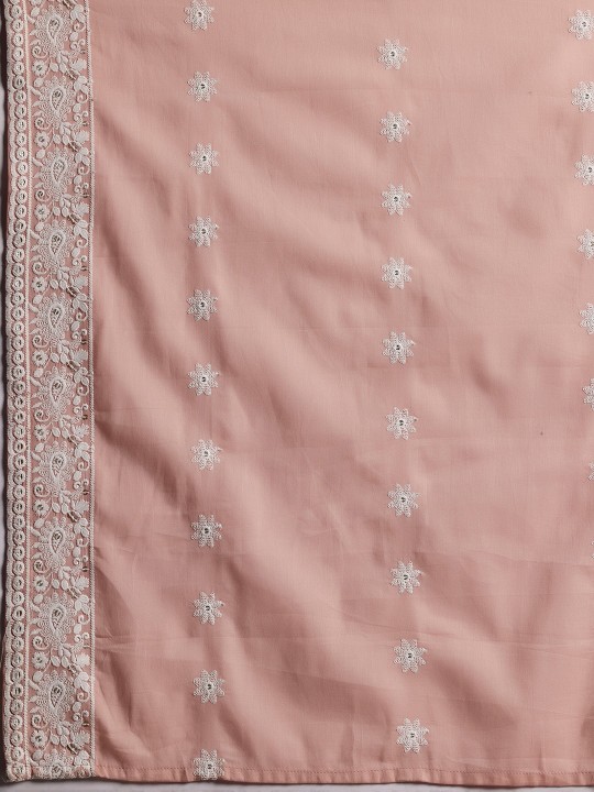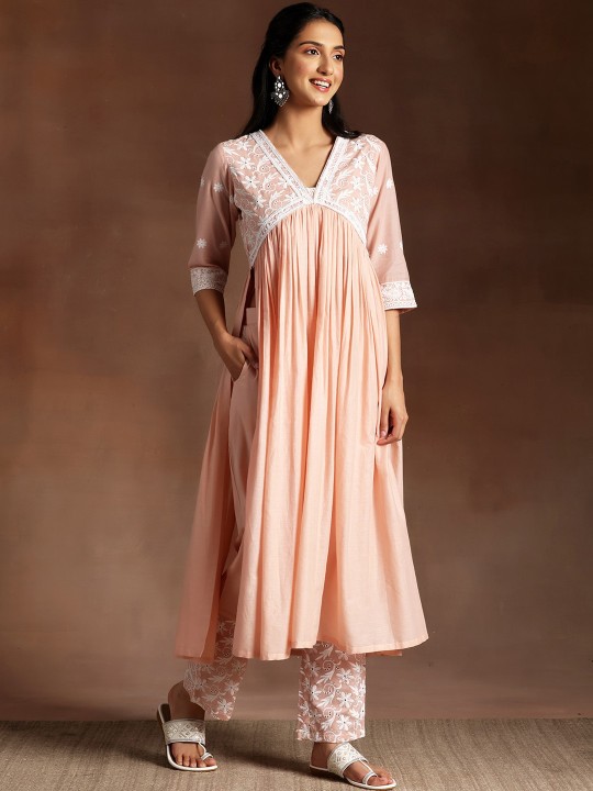Peach Ethnic Motifs Embroidered V-Neck Thread Work Pure Cotton A-Line Kurta Set