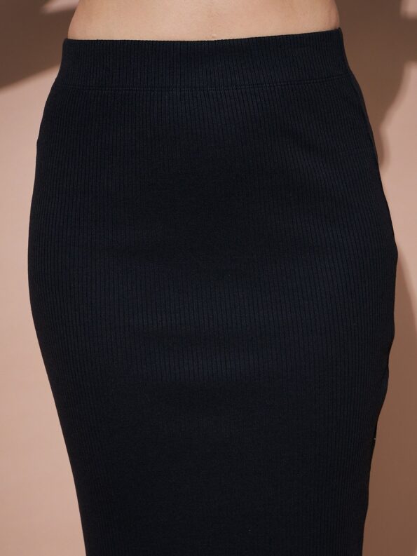 Black solid straight skirt, has an elasticated waistband with slip-on closure