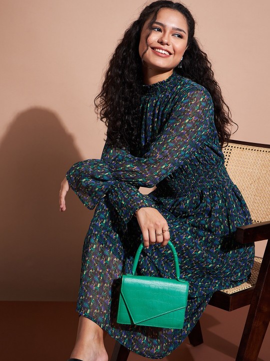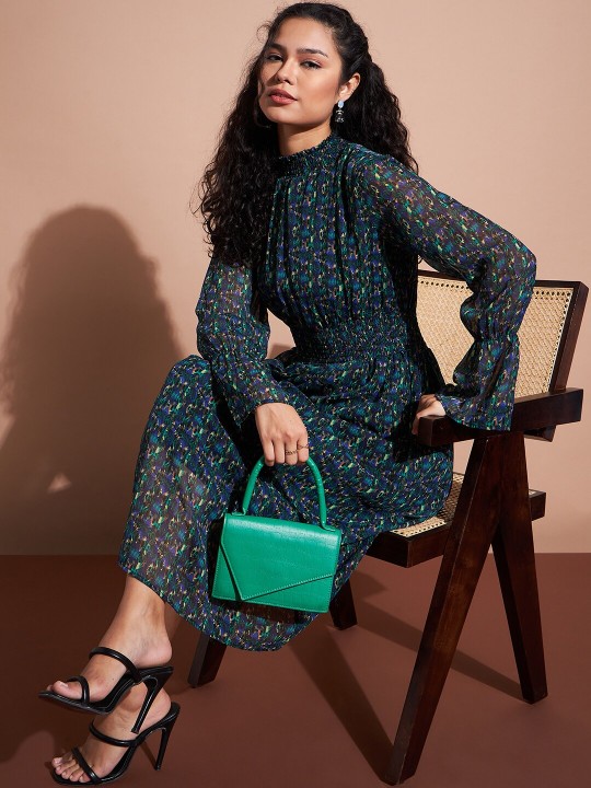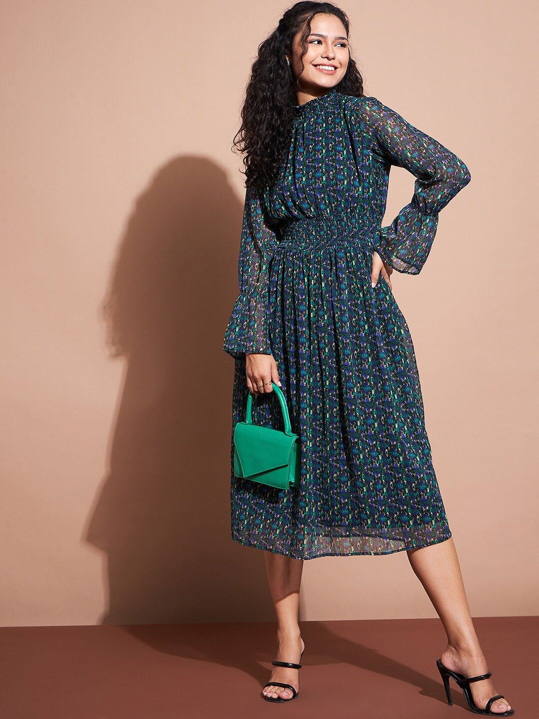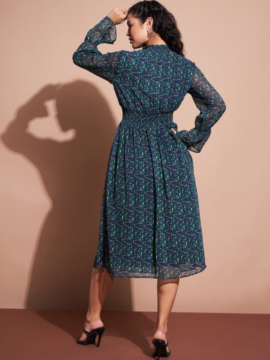 Printed Bell Sleeves Smocked Gathered High Neck Georgette Fit & Flare Dress