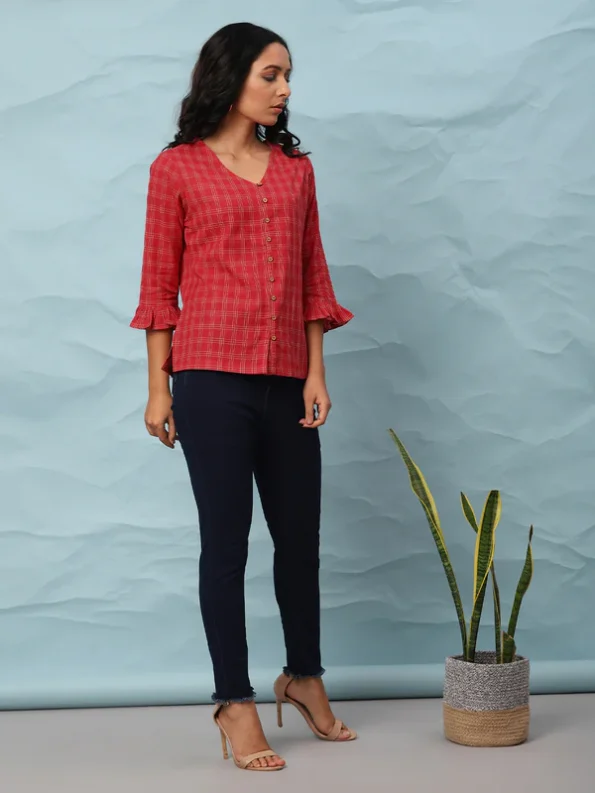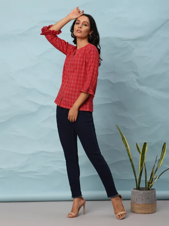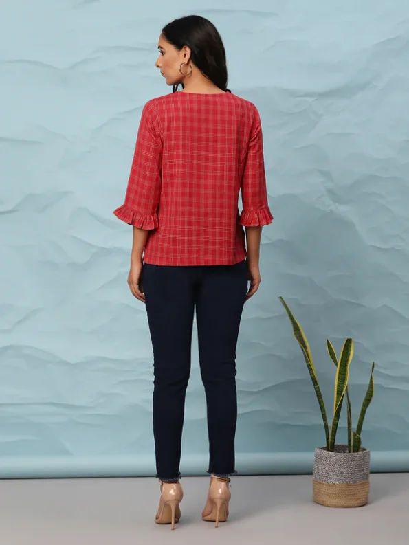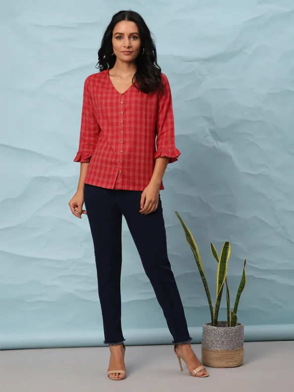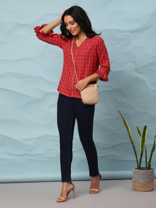 Spice up your wardrobe with this high-quality top. Crafted from cotton with woven checkered design this shirt style V neck top is fabulous for girls night out. Achieve that when you pair this red piece with beaded jewellery and tonal shorts.