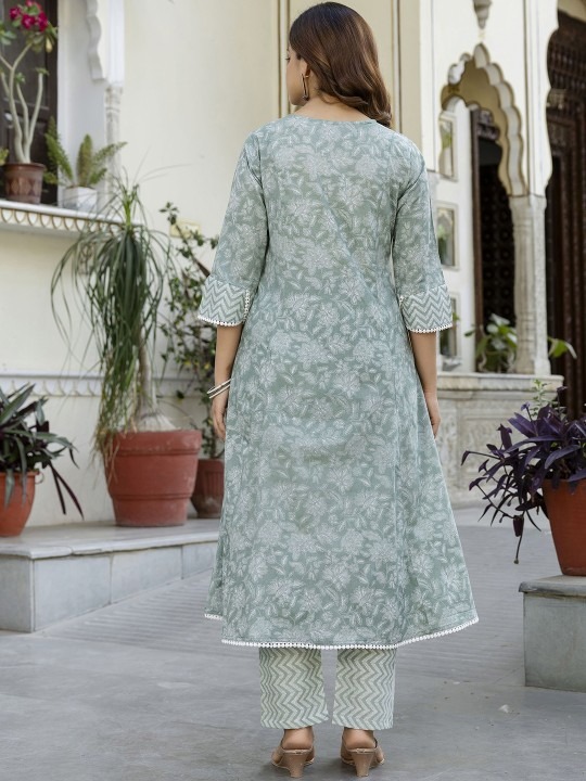 Women Floral Embroidered Cotton Kurta with Trousers & Dupatta