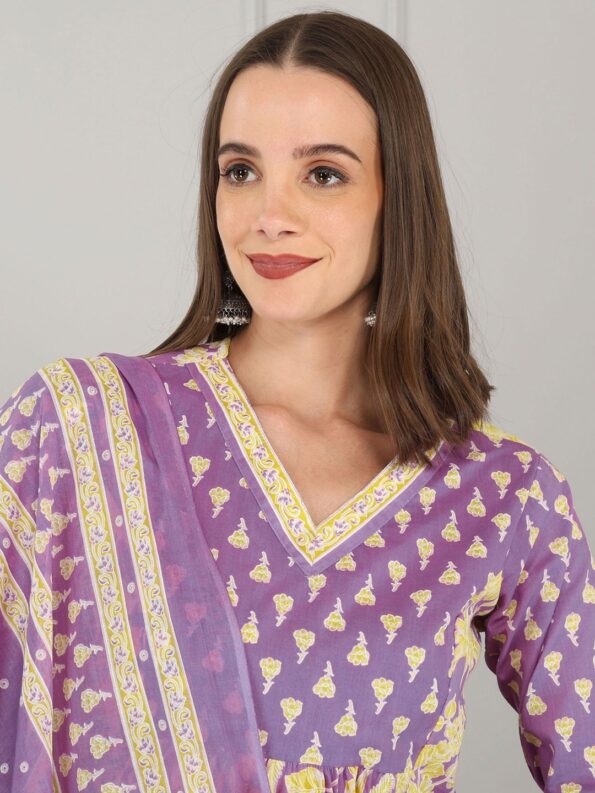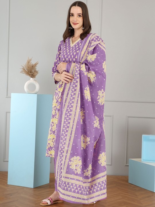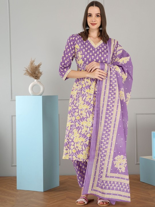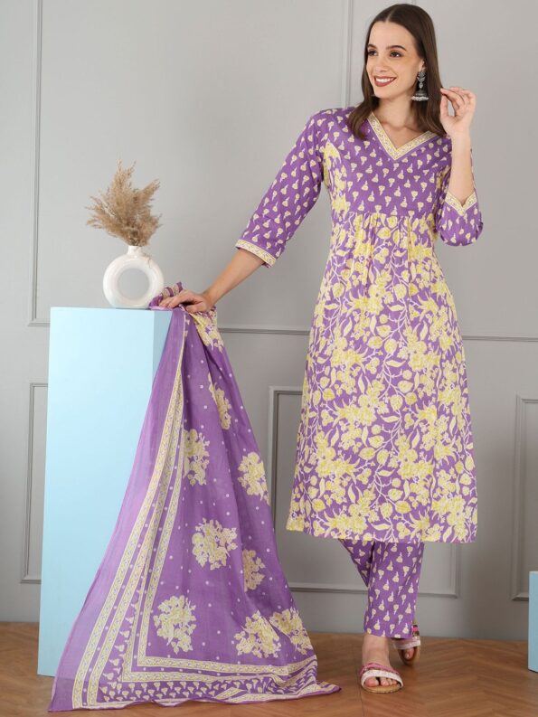 Purple & Beige Printed Kurta with Trousers & Dupatta