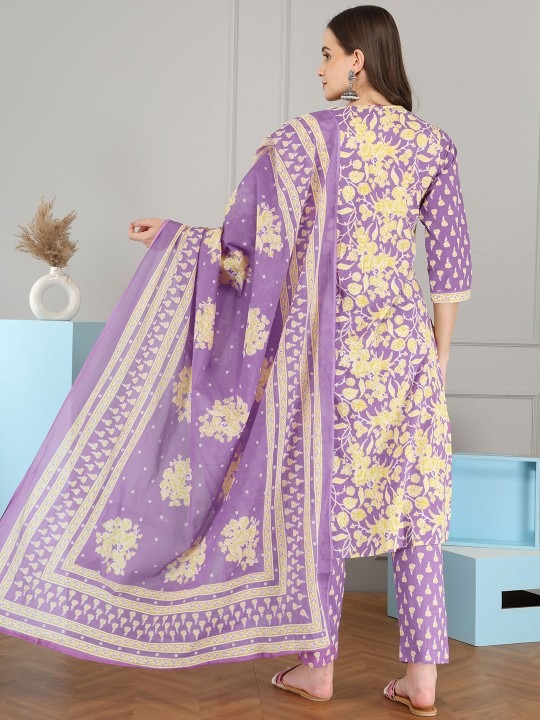 Women Floral Printed Cotton Kurta with Trousers & Dupatta