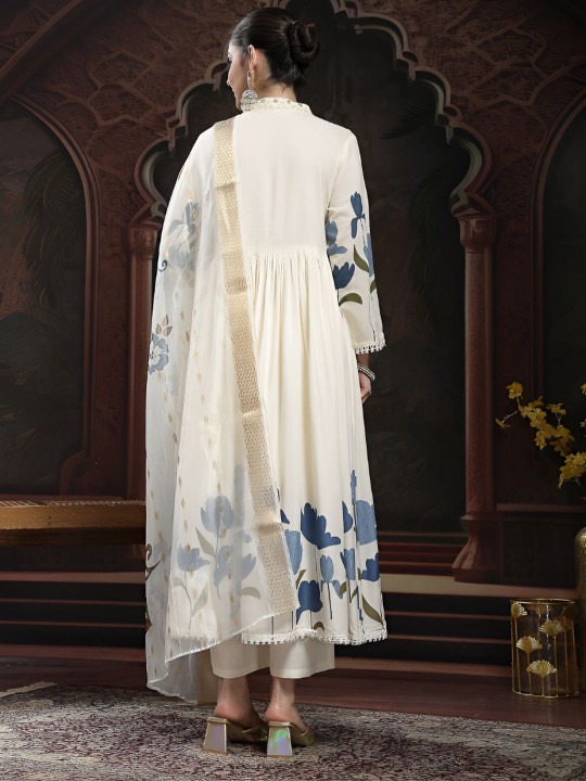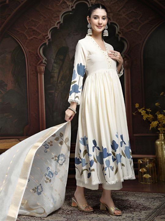 Floral Yoke Design Pleated Round Neck A-Line Kurta with Trousers & Dupatta