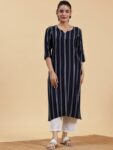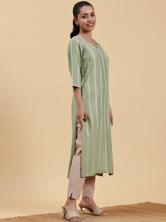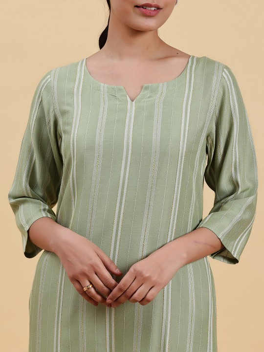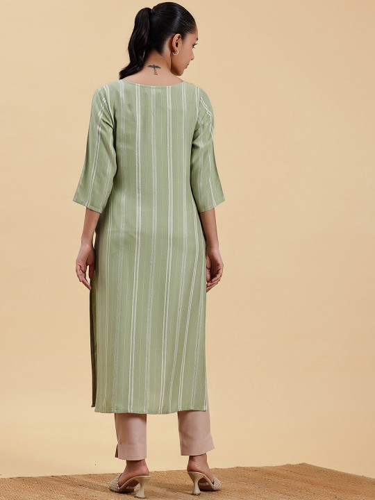 Women Striped Flared Sleeves Thread Work Jacquard Kurta