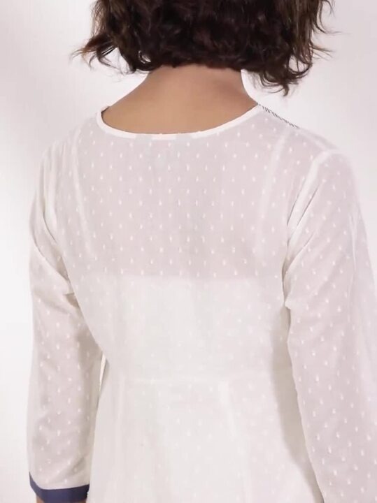 White A-line calf length kurta, has a round neck, three-quarter sleeves, flared hem