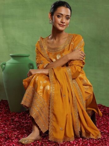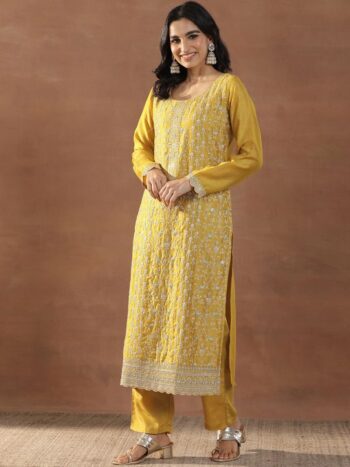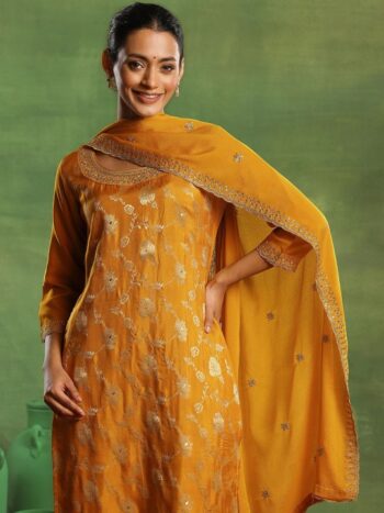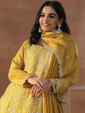 Mustard Yellow Floral Embroidered Sequinned Straight Kurta With Trousers & Dupatta