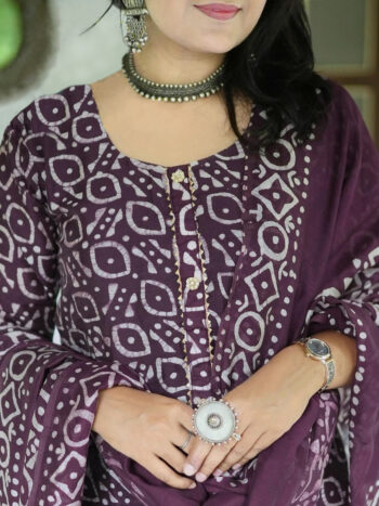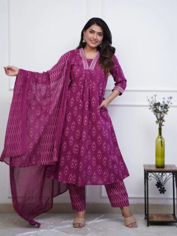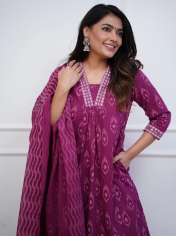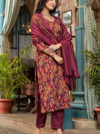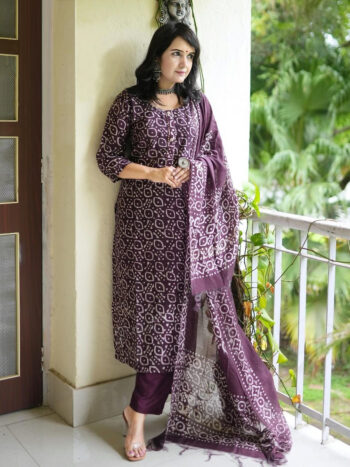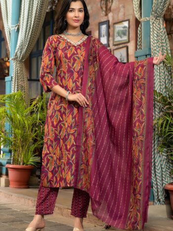 Women Viscose Printed Purple Kurta And Pant Set With Dupatta