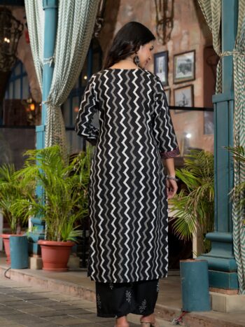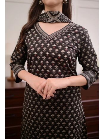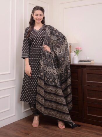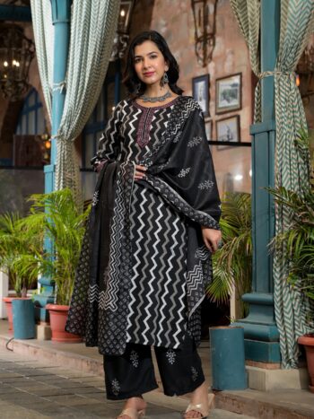 Women Viscose Printed Black Kurta And Pant Set With Dupatta