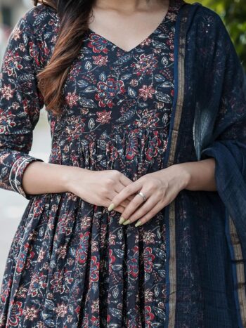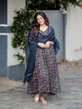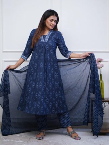 Women Blue Anarkali Kurta And Pant Set With Dupatta