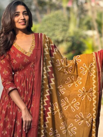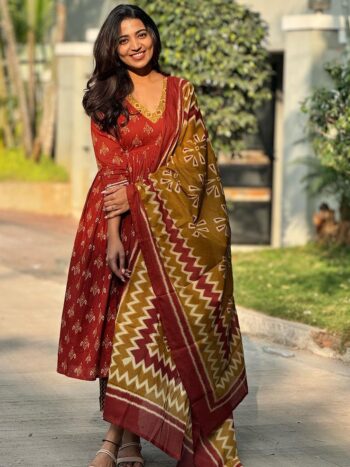 Women Viscose Printed Red Kurta And Pant Set With Dupatta